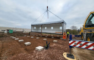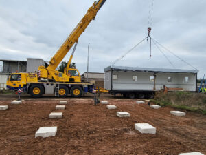 The building’s foundations are the next hurdle. Every modular building needs to be lifted by crane onto a pre-prepared site which clearly needs to be level and capable of bearing the weight of the structure. The type of foundations will be dictated by ground conditions but might be what we call a Jack-Pad solution, or if not, either a solid concrete foundation or individual concrete blocks sited to coincide with the support structure of the building, again GCS can advise the appropriate solution.